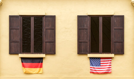 Windows on yellow concrete wall with German and USA flag