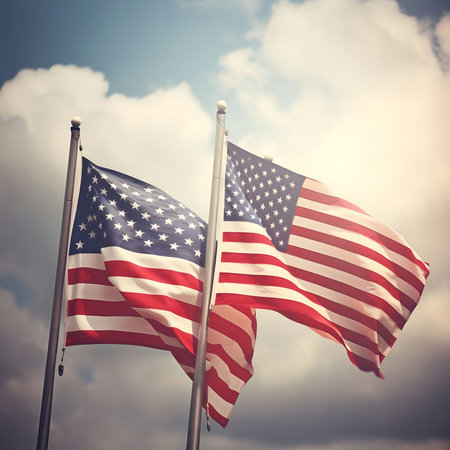 Two American flags waving proudly in the wind against a cloudy sky. The image captures the sense of patriotism and national pride.