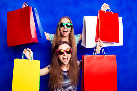Two beautiful female friends on shopping with colorful bags. Toothy smile two young women portrait