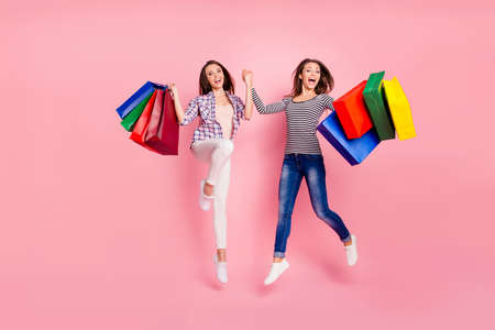 Real bargain full length body size photo of active glad fellows fellowship have free time do purchases amazed discount store consumer success dressed checkered denim clothing pink background