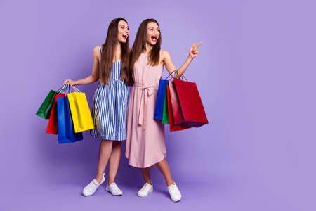 Full length body size photo two people beautiful she her models chic ladies carry many packs direct empty space laugh laughter fellowship wear casual dresses isolated purple violet bright background