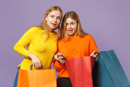 Two excited young blonde twins sisters girls in vivid clothes holding package bag with purchases after shopping isolated on violet blue background. People family lifestyle concept. Mock up copy space
