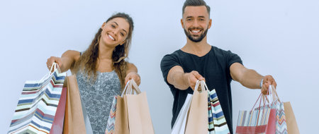shopping and season sale. cropped shot of man and woman with multiple bags in hands.