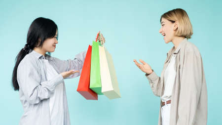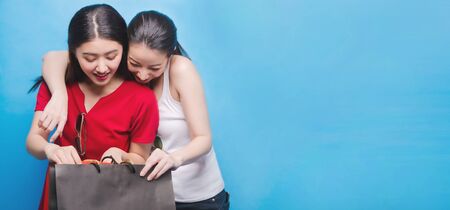 Portrait of two beautiful asian smiling young women with shopping concept. Woman holding shopping bag with attractive smiling. isolated on blue background. banner background with copy space