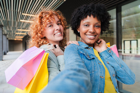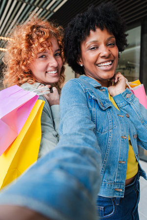 Two joyful friends enjoying a day of shopping while taking a fun selfie with colorful shopping bags