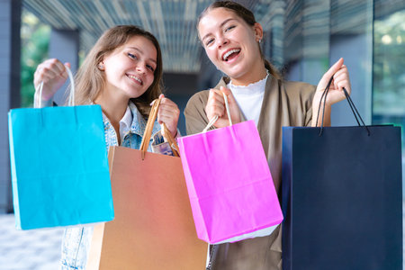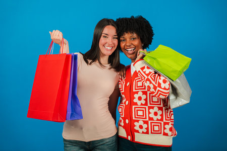 Two cheerful women enjoying a fun day out, joyfully holding colorful shopping bags and smiling brightly, celebrating their recent purchases and