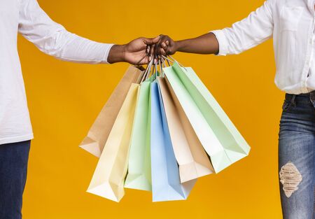 Family shopping and sales concept. Lots of shopping bags in hands of african american couple, closeup