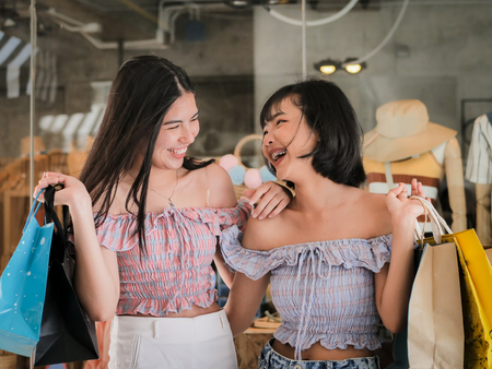 Two beautiful asian women talking together while spending their time shopping at the mall