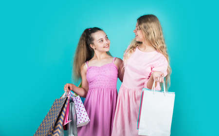 buy gifts and presents for holiday. shopaholic kids with purchase packages. happy children go shopping. black friday concept. kids on cyber monday. big sale. teen girl hold paper bags. Taking two