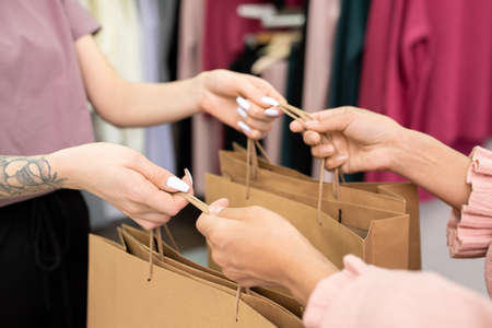 Hands of young man passing paperbag and of female clerk taking it while serving client of boutique or showroom in the mall