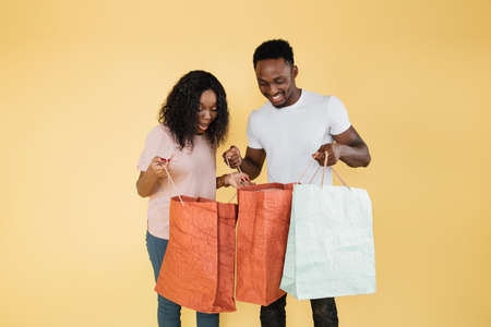 Excited african american woman and man look at camera other and hold shopping bags. Happy curly girl and guy in casual clothes happy that making purchases.