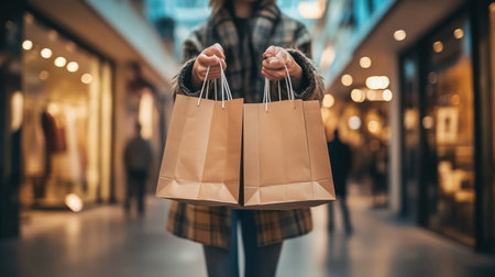 A stylish individual stands in a contemporary shopping mall, holding two paper shopping bags, embodying the excitement of a retail experience filled with urban flair.