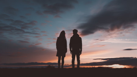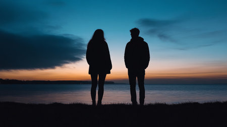 Silhouettes of a couple, on a beach at sunset, generative ai