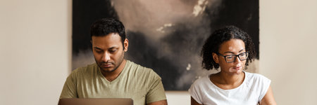 Interracial couple stand with their backs to each other and print messages or surf Internet from mobile phones. Technology, distancing, smartphone, social networks concept