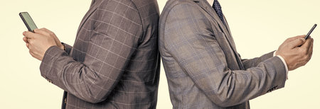 communication online. businessmen having negotiation on phone isolated on white. business texting in blog. online business blogging. business men in suit use phone communication. Texting etiquette
