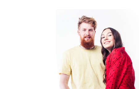 young attractive couple together having fun happy smiling isolated on white background, emotional posing, lifestyle people concept
