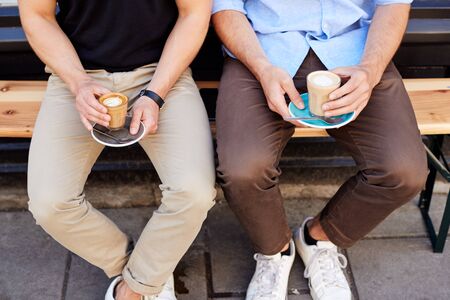 Close Up Of Two Men Sitting Outside Coffee Shop Drinking Coffee
