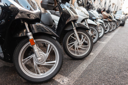 Motorcycles are parked in the city. Bike wheels with rubber. Urban transport in a European city, Italy
