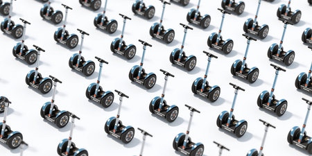 Detail of many electric scooters parked and ready to ride.