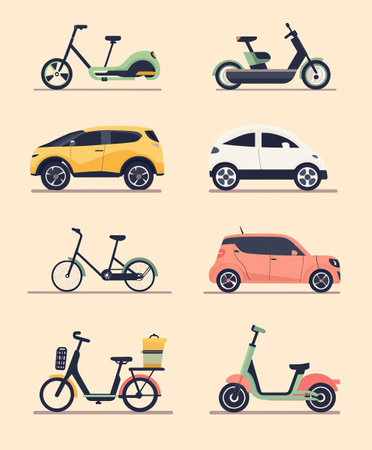 An illustrated collection showcasing a variety of modern eco friendly transportation solutions including electric bicycles scooters motorcycles and compact cars all depicted in a minimalist