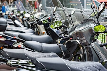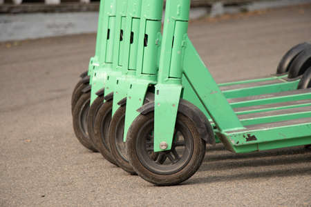 Green modern scooters or electric scooters are kept in order with front wheel part focus. Daily city commute concept using electric vehicles