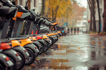 Electric scooters lined up on the urban sidewalk