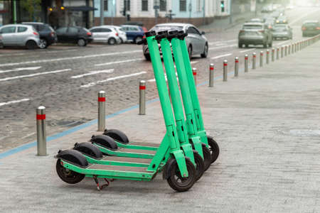 Green electric scooters for rent parked on the city.