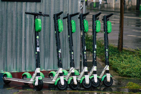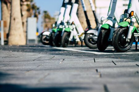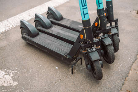 Electric urban transportation. The row of electric readies to ride scooter bikes with accumulators in the center of a city on the pavement stone.