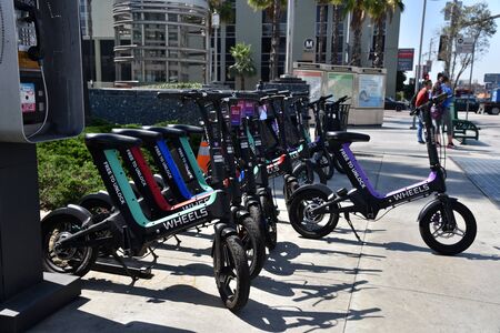 LOS ANGELES, CA/USA - JULY 10, 2019: Mini Electric Bicycles near the Metro Station are replacing rental bikes