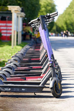 Saint Petersburg, Russia - May 30, 2021: Electric scooters in the parking lot of the rental station. Modern mobile transport for moving around the city