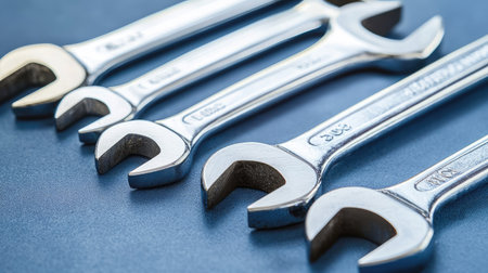 A close-up view of five chrome-plated wrenches lined up neatly on a blue surface. This image showcases the quality and design of essential tools for any maintenance or repair task.