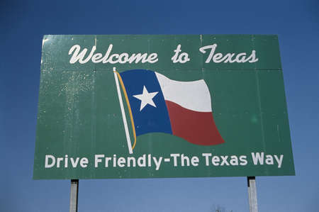 This is a road sign that says, Welcome to Texas, drive friendly, the Texas way. It is against a blue sky with he Texas state flag in the center.