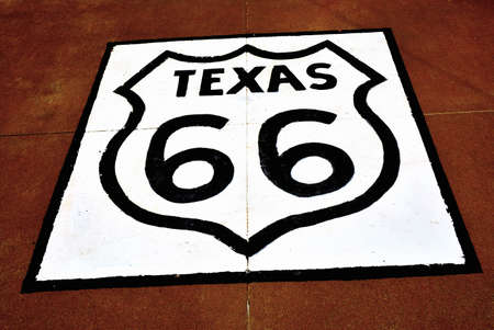 Historic Route 66 sign on the asphalt in Texas.
