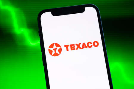 Poltava, Ukraine - May 9, 2022: Index of Texaco oil prices, logo close-up. Green stock market graph background. Gasoline and energy industry concept