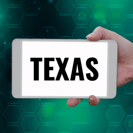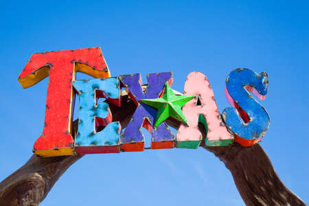 Hand writing sign Texas. Business concept based on Caddo word taysha meaning friends and its located in us