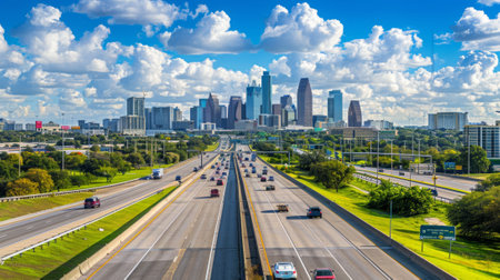 Aerial View of a Busy Multi-Lane Highway with Heavy Traffic Leading to a City Skyline at Sunset. Concept of Urban Traffic, Cityscape, Transportation, Commuting.