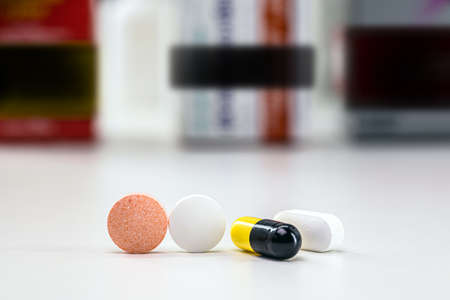 Drug prescription for treatment medication. Pharmaceutical medicament, Pharmacy theme, Heap of red white medicament