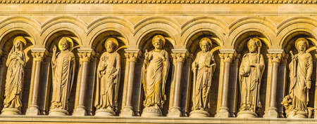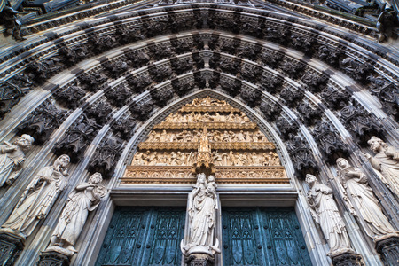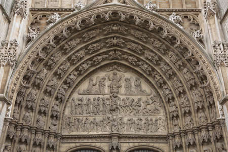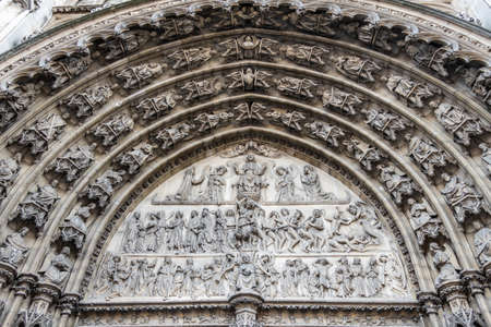 Antwerpen, Belgium: Closeup of beige stone bow full of statues above the main entrance of Notre Dame, Onze-Lieve-Vrouw, cathedral.