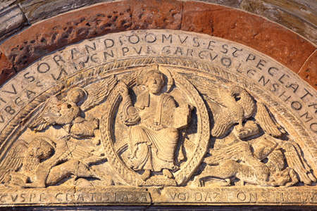 MAASTRICHT, NETHERLANDS - AUGUST 03, 2019: Carvings representing the Christ (tympanum) located above the access door from the cloister to the church, basilica of Saint Servatius, 11th century Cathedral