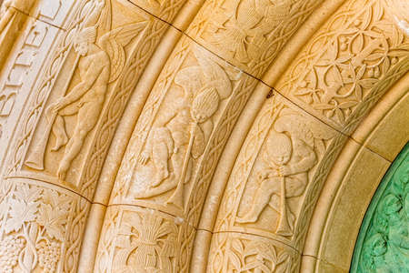 Vezelay, France - July 29, 2018: Main tympan of the romanesque church and abbey of Vezelay in Yonne, France.