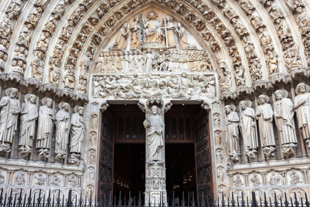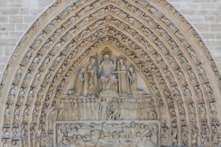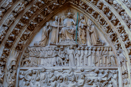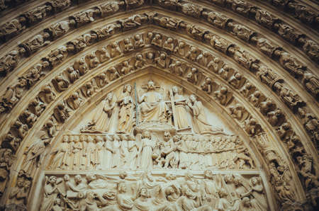 Medieval Sculptures of the Coronation of the Blessed Virgin Mary by Christ at the Cathedral of Notre Dame, Paris, France.