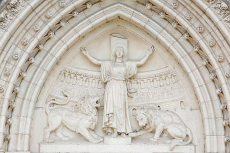 Tympanum depicting martyr Saint Blandine with lions. France.