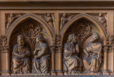 Wurzburg, Germany - July 16, 2019: The tympanum shows the Coronation of the Virgin portal of the Marienkapelle in Wurzburg, Bavaria, Germany.