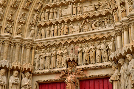 Reims France August 06, 2020 View of the exterior facade of the Roman Catholic Notre Dame de Reims Cathedral, a city in the Grand Est region of France and one of the oldest in Europe