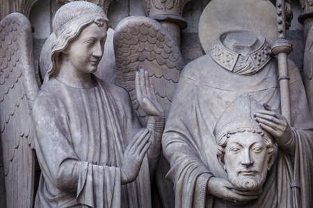 Saint Denis without head and angel, Notre dame facade detail in Paris, France