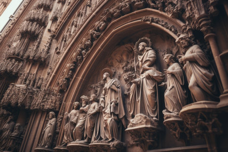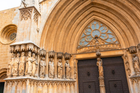 Statues of saints decorating the richly decorated main entrance of Tarragona cathedral, a stunning example of Gothic and Romanesque architecture