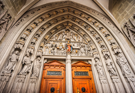 The main portal at the main gate of Saint Nicholas of Myre Parish Church of Freiburg, constructed around 1380, representing a Last Judgment, in Fribourg, Switzerland.