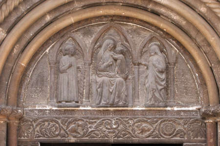 Gothic relief of the Virgin and Child, on the right is St Anastasia, and to the left St Chrysogonus, Cathedral of St Anastasia in Zadar, Croatia