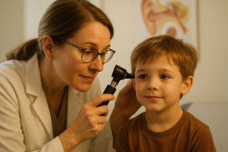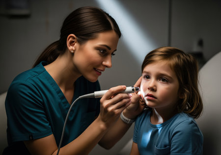 Pediatrician using otoscope examining ear of young patient during medical consultation in hospital