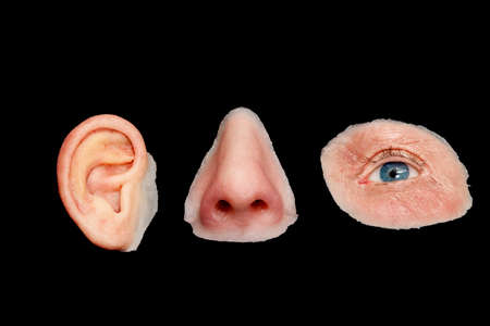Artificial Colored Silicone Made Facial Prostheses, Ear, Nose, Eye, Isolated on Black Background.